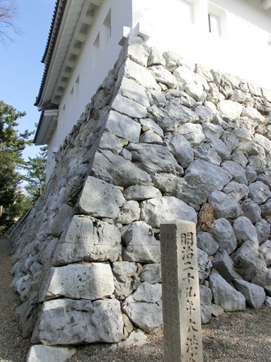 A stone monument marks the water level during the flood at the main castle tower that occurred in 1896. The maximum flood depth in Ohgaki reached a depth of 4.2 meters. The appearance of the main castle tower is shown in the below picture.