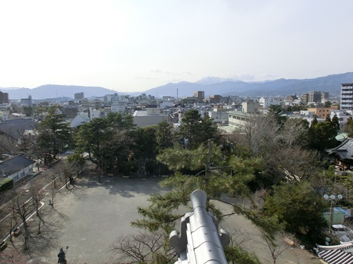From the top floor of the main castle tower, you will see the main bailey and Mt. Ibuki, approximately twenty kilo-metes to the north-west. Ohgaki Castle once had a large castle area. Today, only the main bailey remains, but the restored main castle tower, turrets, and relocated castle gates convey the atmosphere of the time. |