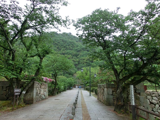 This building was constructed in 1907 by IKEDA Nakahiro, the sixteenth head of the Tottori IKADA Clan, when Emperor Taisho, then Crown Prince, visited Tottori Area. It's said to be in the French Renaissance style, and the white building is very beautiful. It was designated as a National Important Cultural Property in 1973. Please refer the pages of "Jinpukaku Hall" : http://cf916626.cloudfree.jp/HandE_Japan/TravelDestinations/Chugoku/JinpukakuHall_E.html I continued to walk further from Jinpukaku, and turned left at the foot of Mt. Hisamatsu. "Naka-Shikiri-Mon" Gate is located just beyond the left turn.