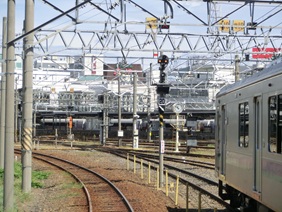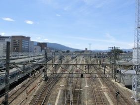松本を発車すると、数多くの留置線の並ぶ松本駅